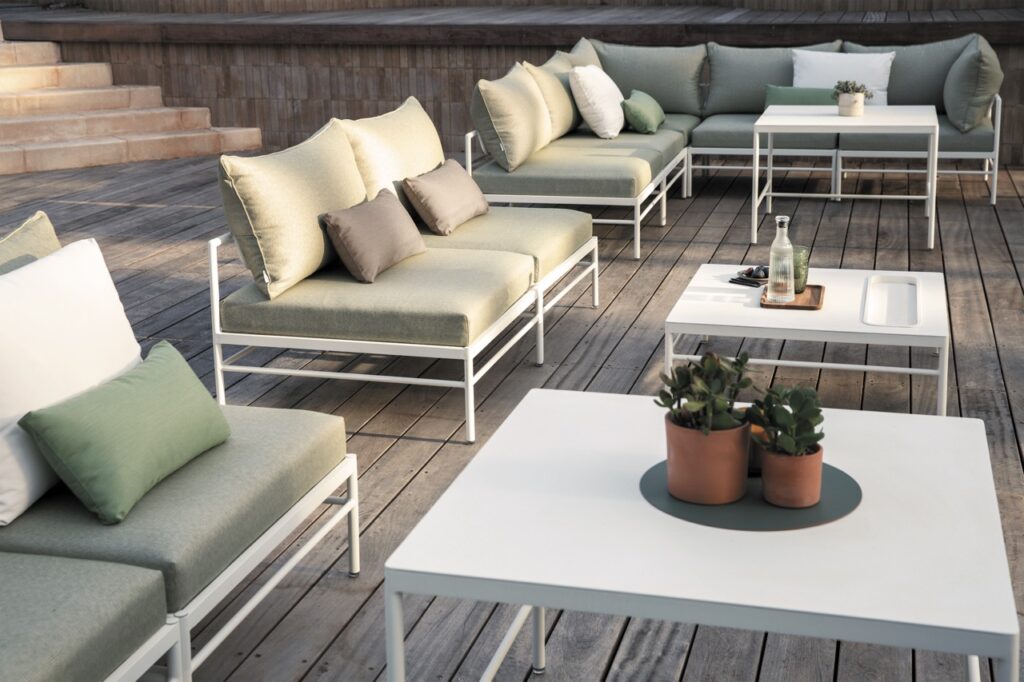 La chauffeuse Rivage de Fermob est un module idéal pour créer un salon de jardin lounge confortable et modulable. Avec son assise large et profonde, elle s’intègre parfaitement dans un espace extérieur contemporain.