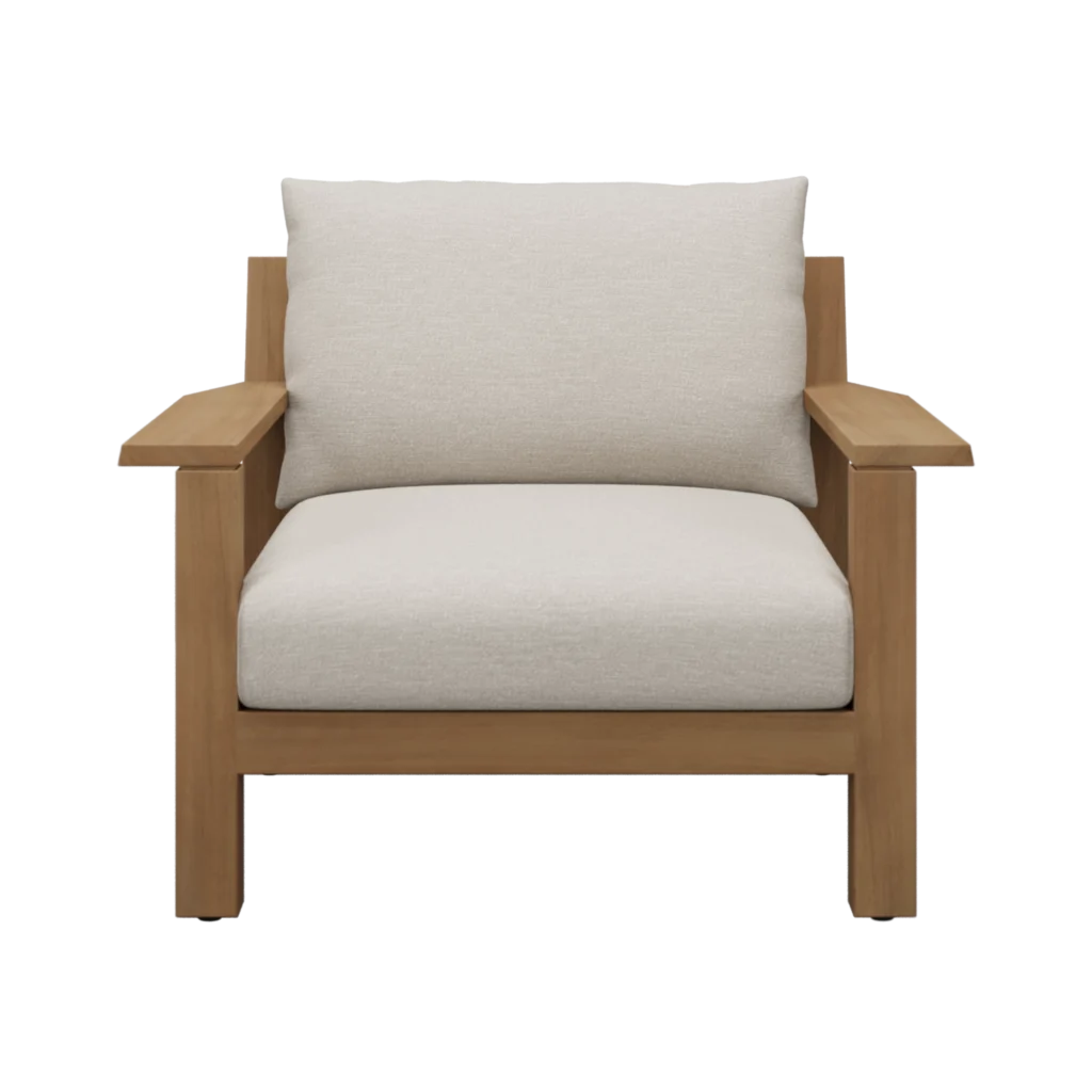 Le fauteuil est équipé de coussins confortables recouverts d’un tissu outdoor coloris ambre craie blanche, apportant douceur, luminosité et élégance à l’ensemble.