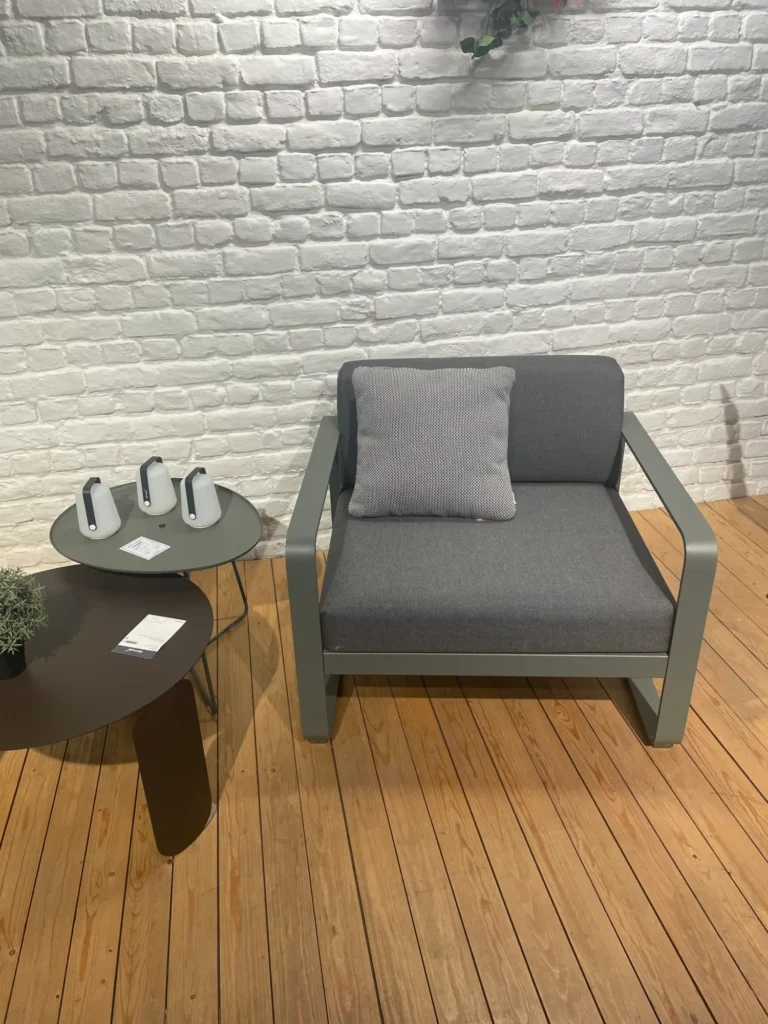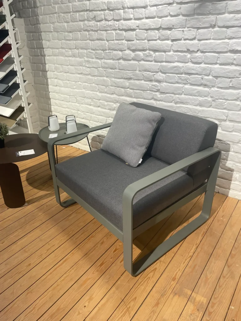 Modèle d'exposition - Fauteuil Bellevie en aluminium laqué romarin et coussins en tissu Sunbrella gris graphite de la marque Fermob.