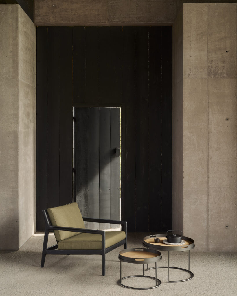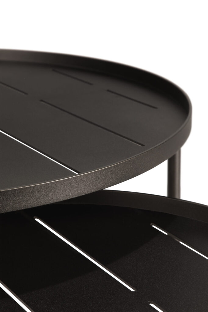 Grâce à leurs hauteurs complémentaires, les tables se superposent partiellement pour créer du relief et offrir plusieurs surfaces pratiques pour déposer boissons, livres ou accessoires outdoor. Elles structurent naturellement l’espace tout en conservant une sensation de légèreté visuelle.