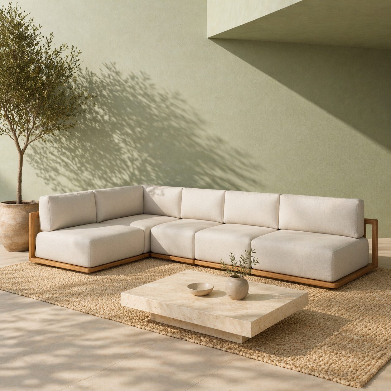 SOLYS laat zich inspireren door een tijdloze mediterrane architectuur: eenvoudige volumes, rustige lijnen, natuurlijke materialen en alomtegenwoordig licht. Massief FSC-gecertificeerd teakhout en mineraal beton zijn gekozen om hun vermogen om de tand des tijds te doorstaan — ze verouderen mooi, integreren zich vanzelf in hun omgeving en worden met de jaren alleen maar mooier. Technische stoffen en schuimen zijn ontworpen om alle weersomstandigheden te weerstaan, zonder in te boeten op comfort.