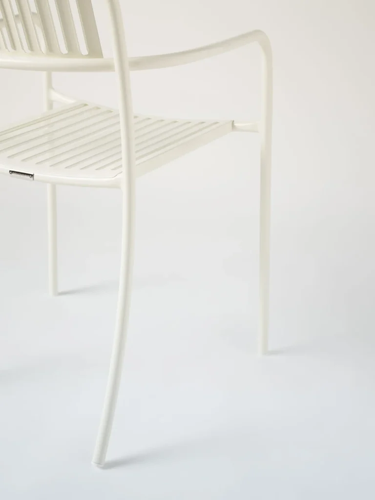 De slanke, luchtige structuur wordt versterkt door een zitting met opengewerkte, laser-gesneden lamellen, die zorgen voor een grafisch effect en optimaal comfort. Het vloeiende ontwerp wordt gekenmerkt door een doorlopende gebogen buis die de poten met de rugleuning verbindt.
