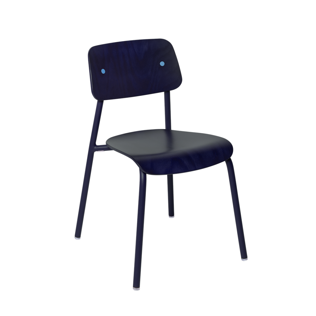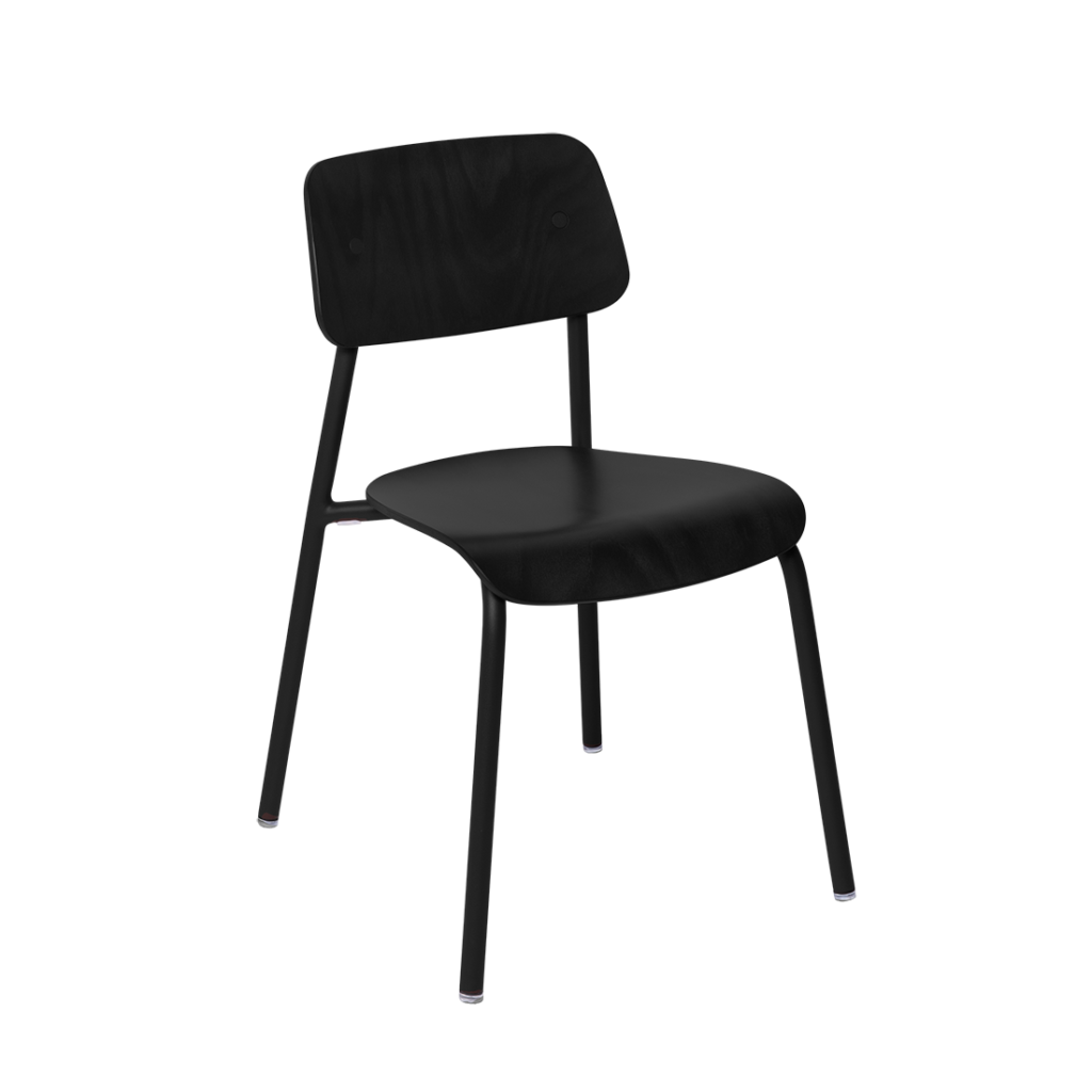 De stevige stalen structuur wordt gecombineerd met een zitting en rugleuning in gebeitst hout, wat zorgt voor een perfecte balans tussen duurzaamheid en warmte. Het gebeitste hout benadrukt de natuurlijke houtnerf en geeft elke stoel een uniek karakter.